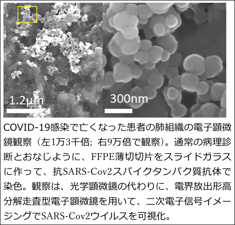 光学顕微鏡での病理診断に用いていたスライドガラスに作ったホルマリン固定パラフィン包埋検体(FFPE)の薄切切片をプラズマで処理して、SEMでウイルスの存在を観察できるようにして、次世代のウイルス病理診断を実現しています7)。スライドガラスに作ったFFPE薄切切片に用いたプラズマ処理技術は、長崎県工業技術センターで馬場恒明先生の確立されたプラズマイオン注入法で、ギアや金型の表面改質のためのこのプラズマ技術を最適化したものです。これまでに、私たちはアニリンプラズマイオンを使い、FFPE薄切切片はSEMと光学顕微鏡の両方で検索できるようにして、COVID-19感染で亡くなった患者の肺のFFPE薄切切片中で、SARS-Cov2を可視化しています7)。
